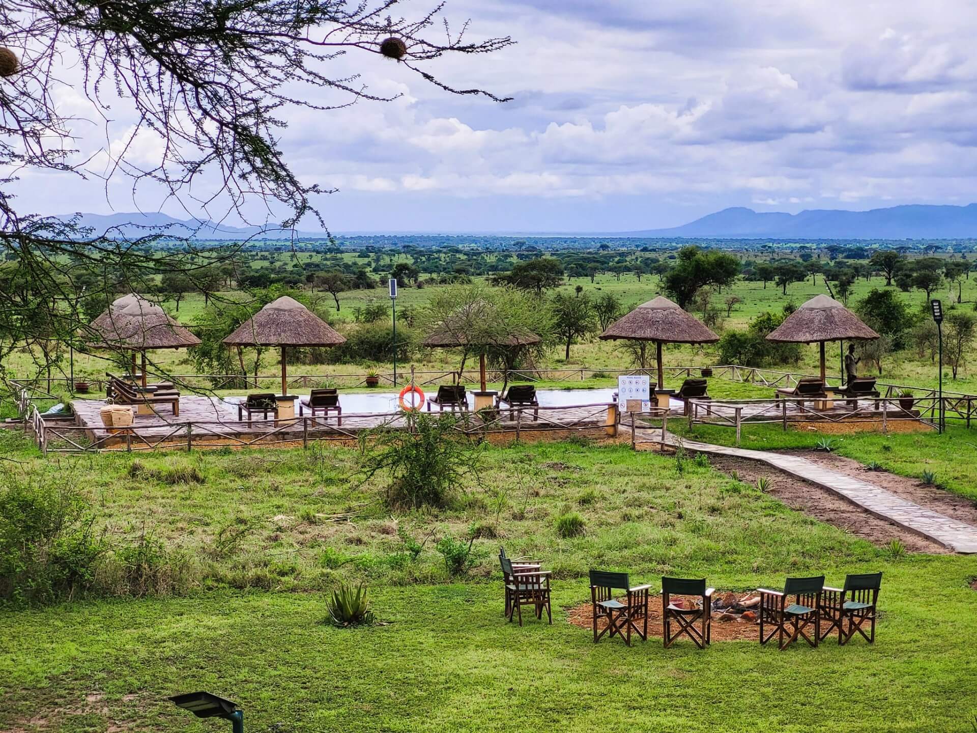 Outdoor pool with stone deck and thatched umbrellas overlooking safari tents and a mountain under a partly cloudy sky