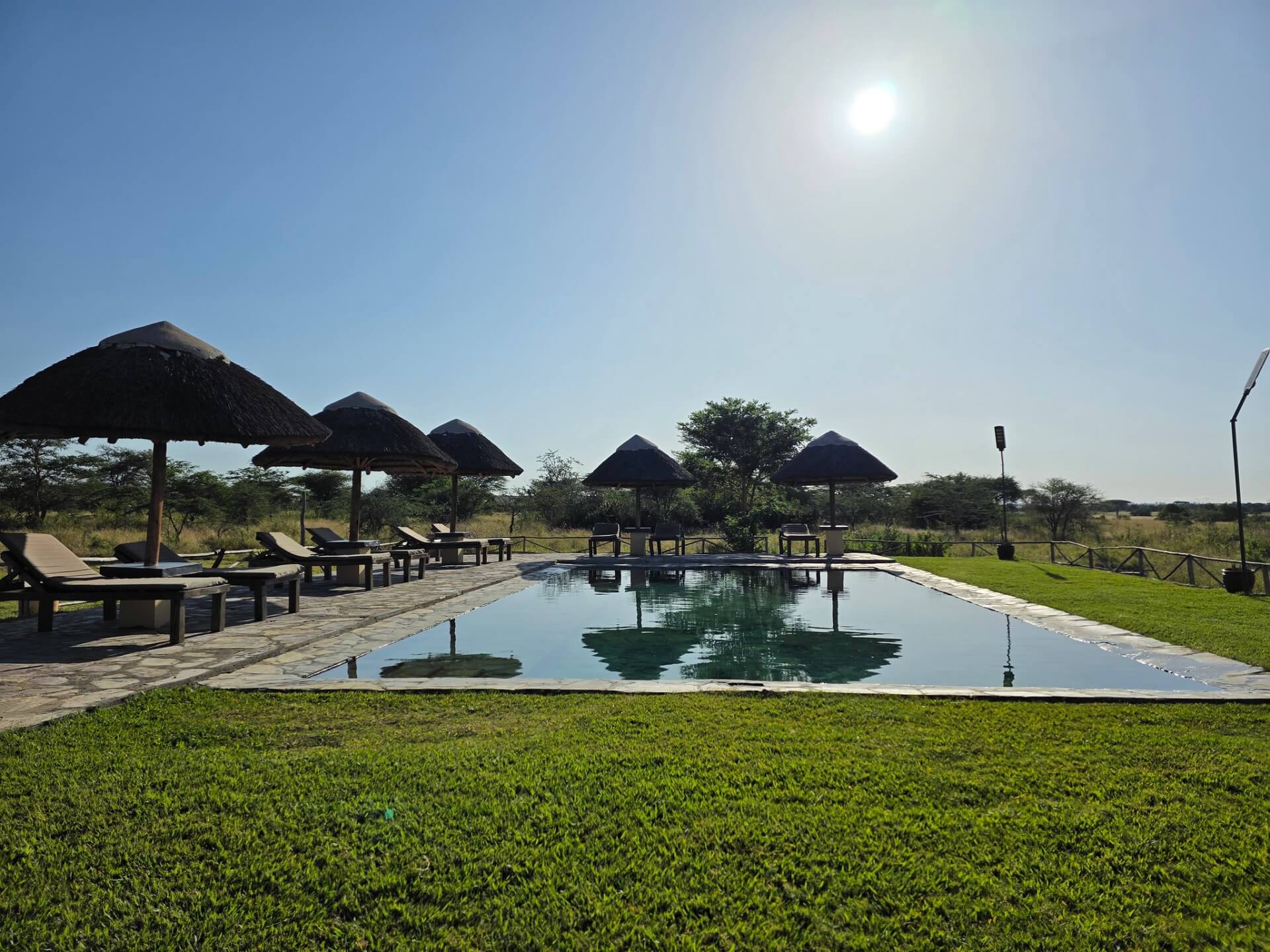 Poolside with thatched umbrellas and wooden loungers, glamping tents beyond, lush lawn and bushland view