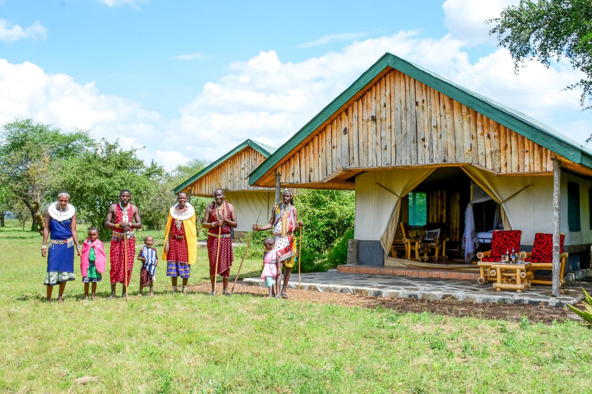 Rustic safari tents with wooden roofs and outdoor seating in a grassy area, with a group of people in traditional Maasai attire nearby