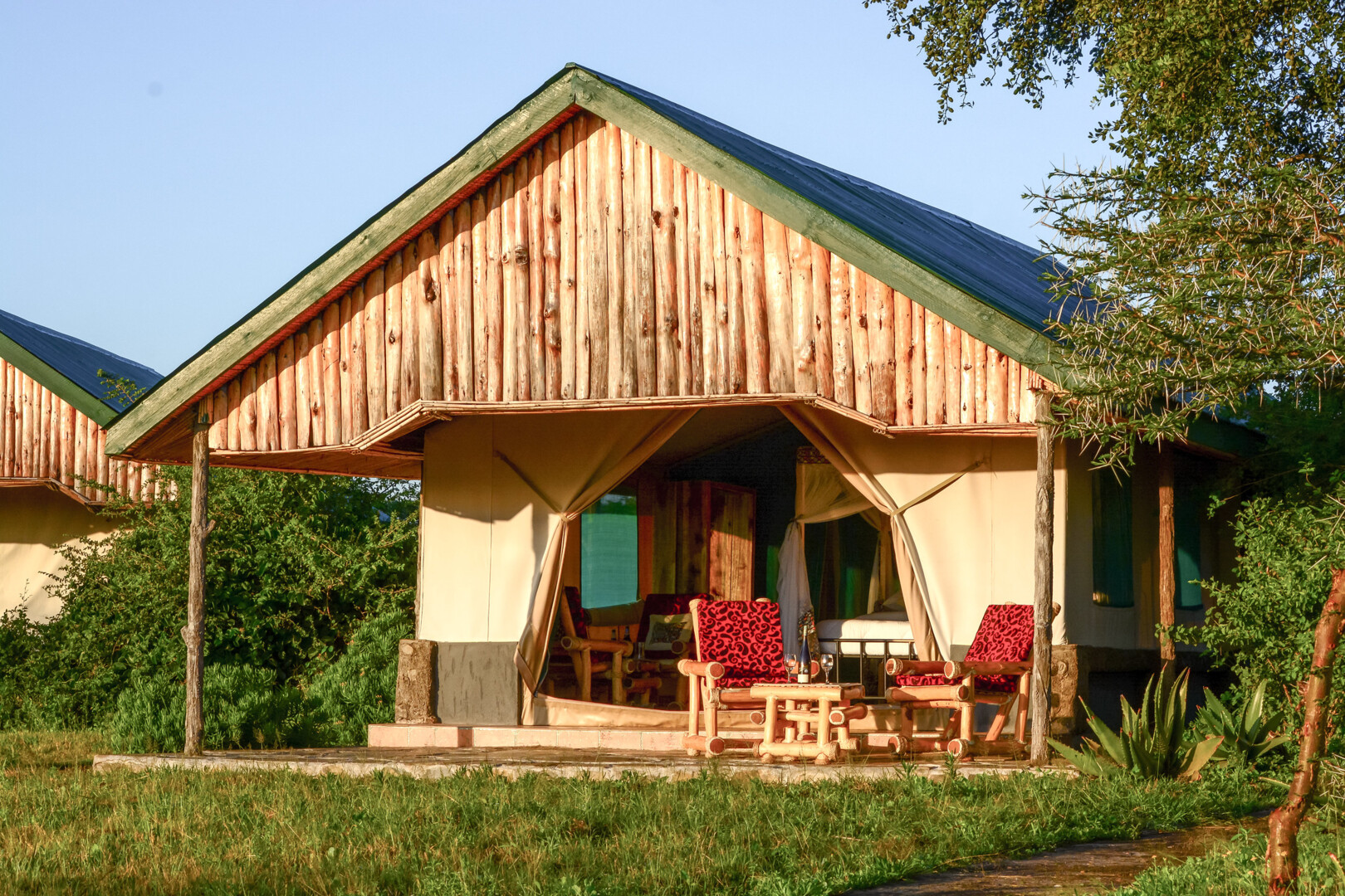 Luxury safari tents with shaded verandas and wicker chairs set on green grass, with zebras grazing nearby under clear blue sky
